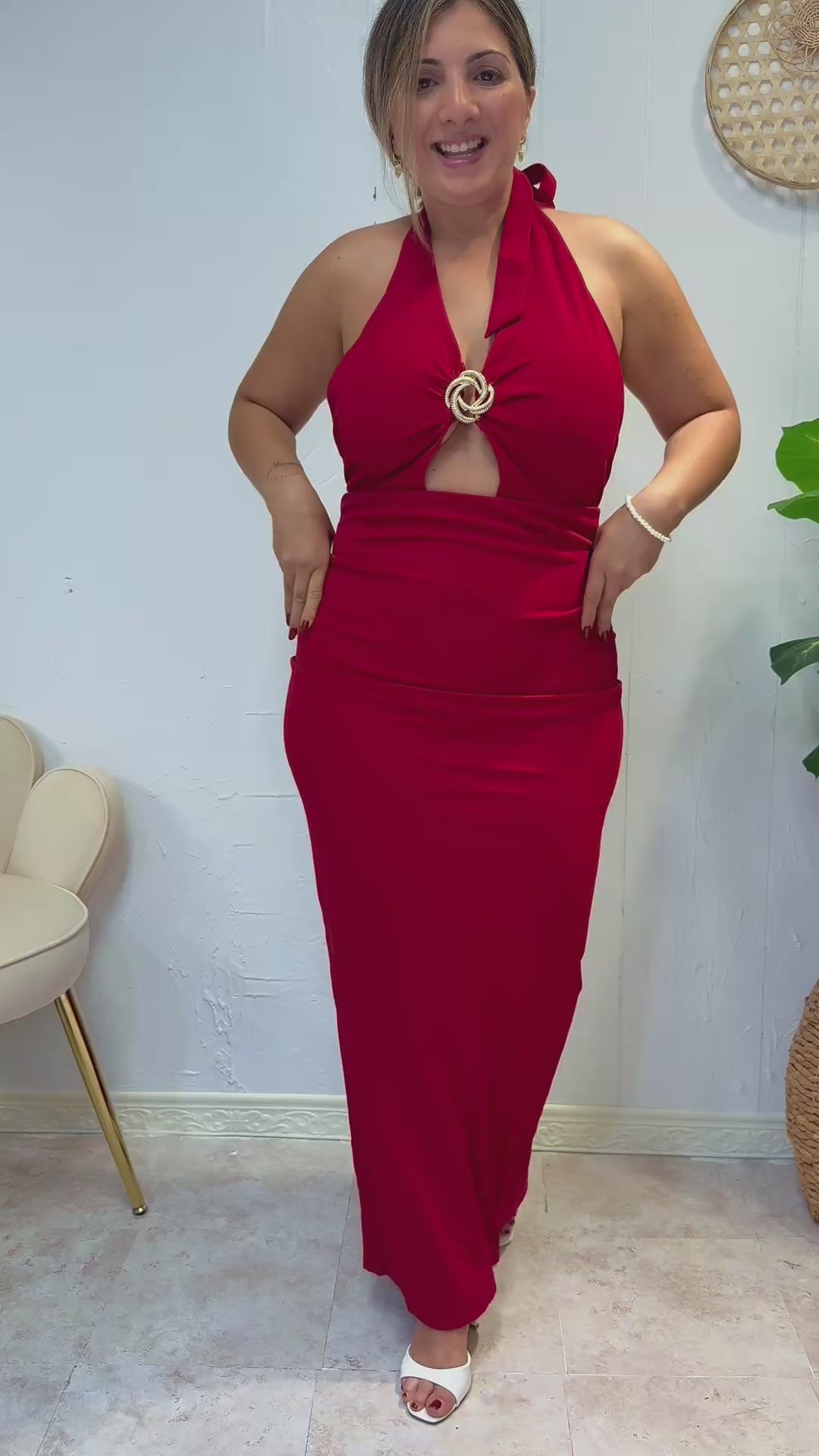 Es la pieza perfecta para robar miradas. Su diseño halter con escote profundo y detalle de aro dorado en el centro realzan la silueta femenina con elegancia y sensualidad.