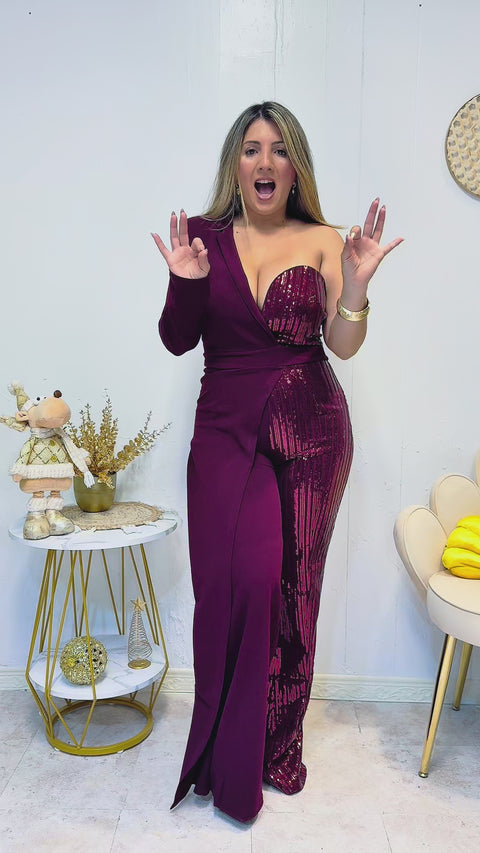 Brilla como una reina con nuestro Jumpsuit Asimétrico Glam Burgundy, una pieza diseñada para robar miradas.