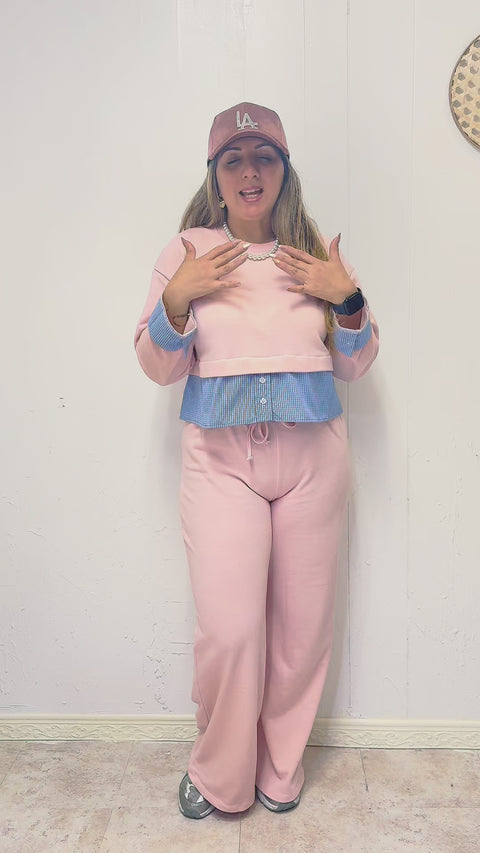 Set cómodo y moderno en tono rosado pastel, ideal para un look casual con estilo. Incluye pantalón palazzo de tiro alto con cintura ajustable y top tipo sweatshirt con detalle de camisa integrada en color azul claro, creando un contraste chic y actual.