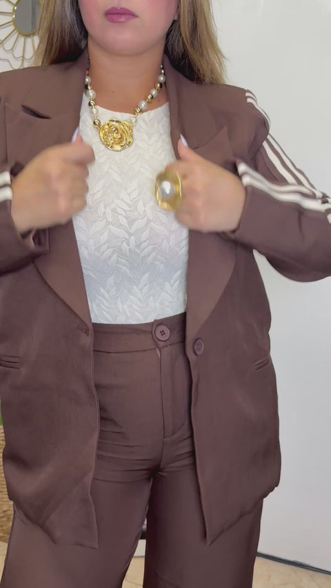Look elegant, empowered, and modern with this chocolate-colored set. Its structured blazer with sporty lines on the sleeves gives it the perfect touch of sophistication and coolness. The palazzo pants flatter your figure and provide all-day comfort.
