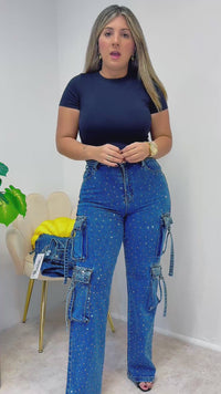 Pantalón de mezclilla estilo cargo con delicados detalles de pedrería que elevan cualquier look. De tiro alto, corte recto y bolsillos funcionales a los lados, combina comodidad con un toque glam perfecto para el día o la noche. Ideal para usar con bodys, tops o blusas ajustadas.