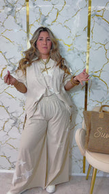 Perfecto para combinar con plataformas, sandalias o accesorios dorados para elevar el outfit. Un set versátil que puedes usar para salir, viajar o para un día casual con glamour.