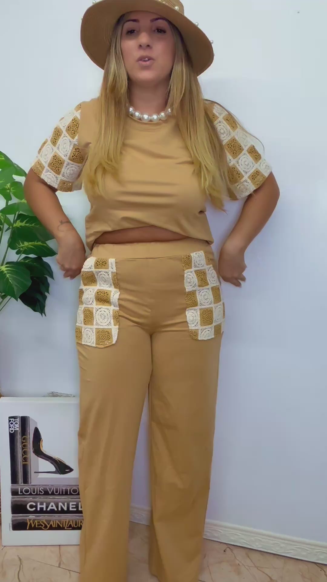 This camel-toned set combines style and comfort with a handcrafted touch.