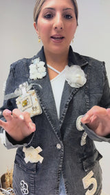 Dale un toque de lujo a tu look con nuestro Blazer Glam Perlas & Flores, una pieza única que combina el estilo denim con detalles couture. Su diseño está decorado con flores en 3D, lazos, aplicaciones de perlas y pedrería, creando un estilo elegante y atrevido.