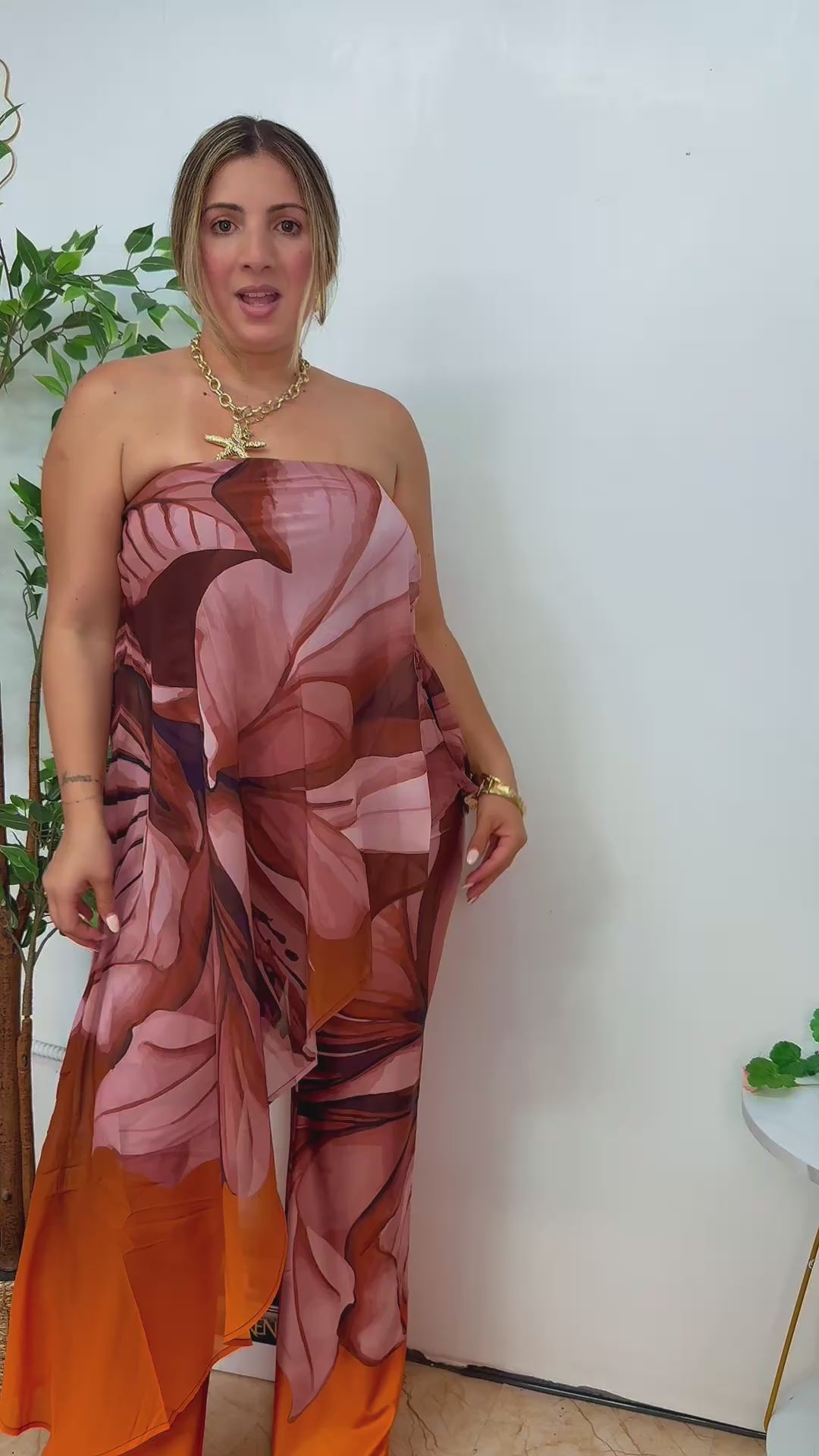 Make your outfit speak for itself with this spectacular flowing tunic set in orange and wine tones.